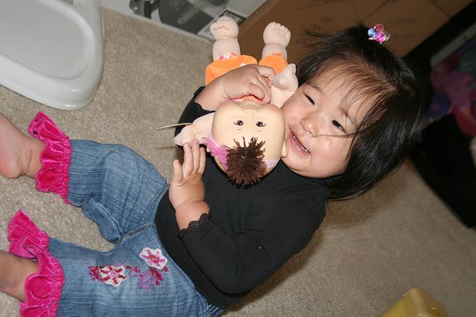 キャベツ畑人形は白人も黒人もいるし、髪の色も様々でたくさん種類があるのだけど、ジェシーが「アジア人がいい!この子に決定!」って選んだのに・・・。