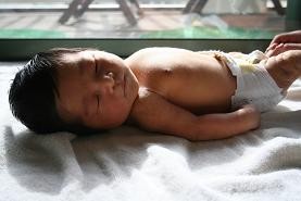 産まれたばかりの赤ちゃんに日光浴。直射日光ではないとはいえ、オムツ一枚でぎゃーぎゃー泣く里花を日に当てる様子にうちの母は気絶しそうになっていた。だけど、黄疸の原因である血液中のビリルビンというのは光に当てると水溶性に変わって汗や尿として体外に排出される。ビリルビンは多くなると脳に沈着して脳障害や時には命にもかかわる「核黄疸」という病気になるので、かわいそうだけど、必死の日光浴なのだ。