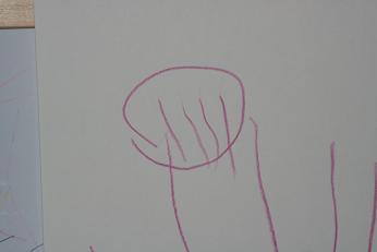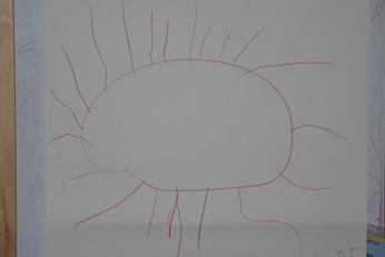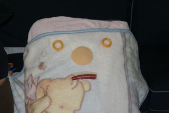 ままごと用の「オニオンリング(目)」、「スライスチーズ(鼻)」、「ベーコン(口)」で作った、怪獣!? らしいです。あんまり怖そうじゃないけど・・・。