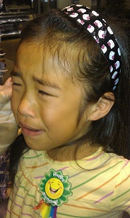 泣いた顔に鼻血出してる小さな女の子がピアシングされている絵。