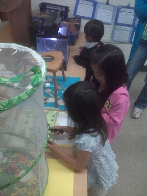 ちょうちょ(手前のグリーンのかご)や金魚(一番奥)の飼育、ルーペで貝を見たりするコーナーも