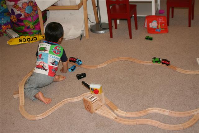 こんどは手で動かすトーマスやパーシーをつなげてレールの上で走らせてる。