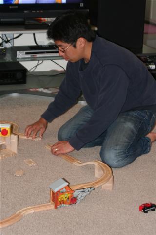 で、今回キャロちゃん家に行った時、Kylerがちょっと大きめのレールセットを持っていて、なおかつ電池で動くトーマスがいて、航晴さんはハマってました。