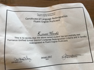 昨年の里花に続き、航晴もELL(英語学習者プログラム)を卒業しました。