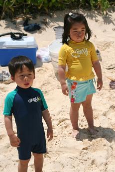 波が怖いらしく、水着に着替えたものの全然入ろうとしない。