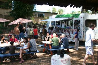 私たちが車を止めたのは二台のワゴンが並んでいる小さな空き地で、なぜか向って左側のワゴンだけ大賑わいを見せている。