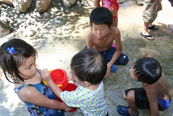 里花は流れてくる水を一生懸命バケツでくみ上げてる。航ちゃんはパパに手を支えてもらってバシャバシャ水の中を歩いてる。
