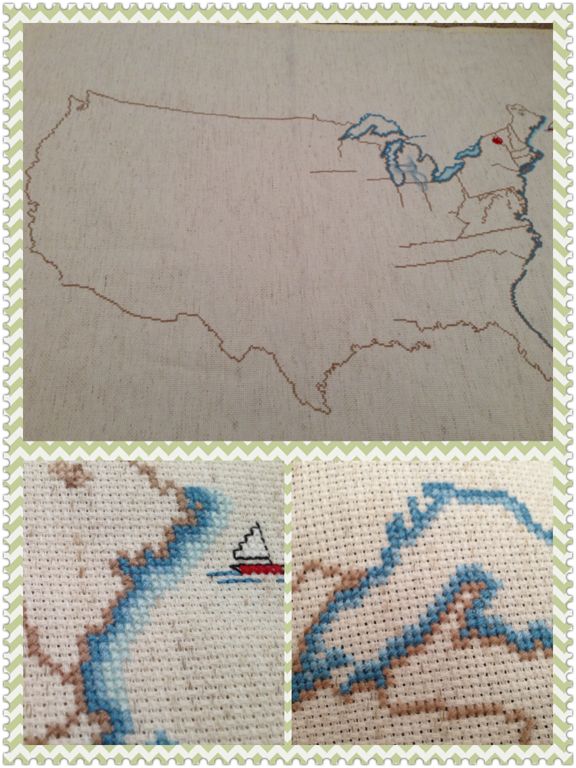 で、たくさん持ってらっしゃる図案集の中から、一目惚れで選んだ「アメリカ大陸地図」をお借りして&基礎を教えてもらいながらチクチクやっています。