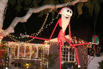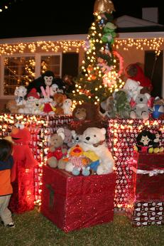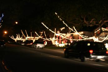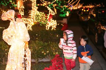 車でゆっくり走りながら見ている人、歩いている人、中にはゴルフカートに乗っているご老夫婦や、サンタ帽やトナカイの角をつけて見学に来ている人もいる。まるで観光地。