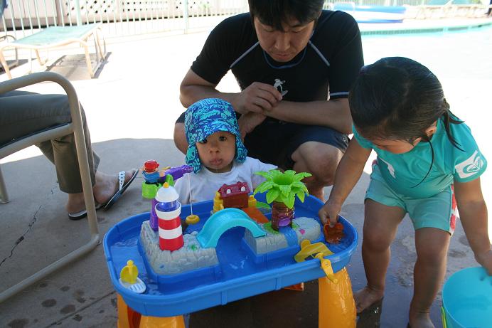 午前中にパパが買って来たお水遊びのおもちゃと、ビニールプールをプールサイドに移動し設置。