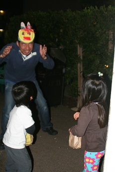 日系幼稚園の豆まきの日をお休みしてしまった里花は楽しそうにパパ鬼にぶつけておりました。