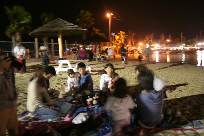 そこでテーブル席(パラソル付)が大人○ドル、とか、砂浜に座って見るのが1人○ドルとか設定されているわけ。