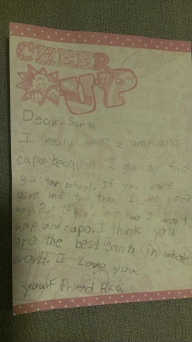 訳:サンタさんへ 私はギタースクールに通っているのでアンプとケイポ(音程を調整する道具)が本当に欲しいです。もし二つも無理ならアンプだけ欲しいです。