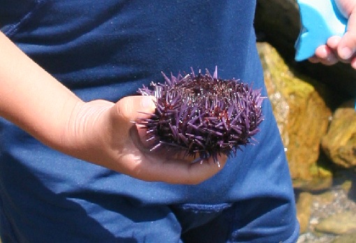 岩と岩の間に生息する紫のウニは見つけるのは簡単。