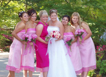 色はこのお店で言う「Watermelon」が新婦のテーマカラーにぴったりだったので、各々が近所のDavids Bridalに出向き、Watermelon色で好きなドレスを選びましょう ということになりました。
