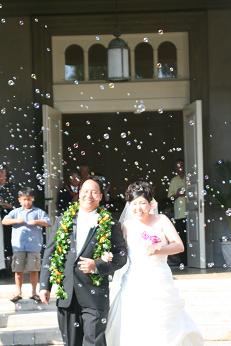 参列者が作るバブルシャワーがハワイの太陽にキラキラと反射して、とても素敵なシーンでした。