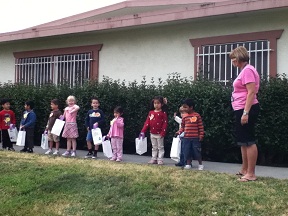 準備完了したところで、お手製の卵用バスケットをぶら下げて一斉に並んだ園児達。