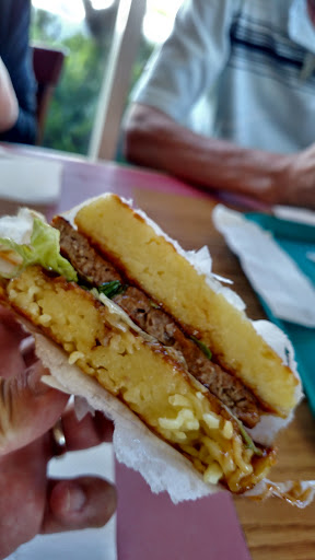 いえいえ、ハワイ店限定のラーメンバーガーとやらを食べてみました。