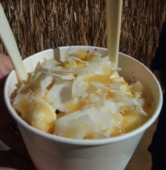 ハワイアンシェーブドアイスって、マンゴーやパッションフルーツなどのトロピカルフルーツ味のシロップがいろいろあるのがいいなあって思うんだけど、妹が頼んだライチシロップがしっかりとした味でおいしかったでーす♪