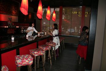 赤と黒をメインカラーにインテリアされた店内は、日本から竹やらすだれやらを輸送し、本物の和のテイストを取り入れていてとてもモダンな感じ。