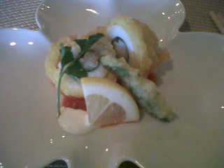 イカでえびと青紫蘇をロールし、てんぷらにしたもの。