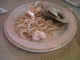 私達もお皿を頼んだ後にフォークも というのは面倒なので、(っていうかアイコンタクトすら取れない状態)最初のアペに使ったお箸でパスタを食べるはにーちゃん。