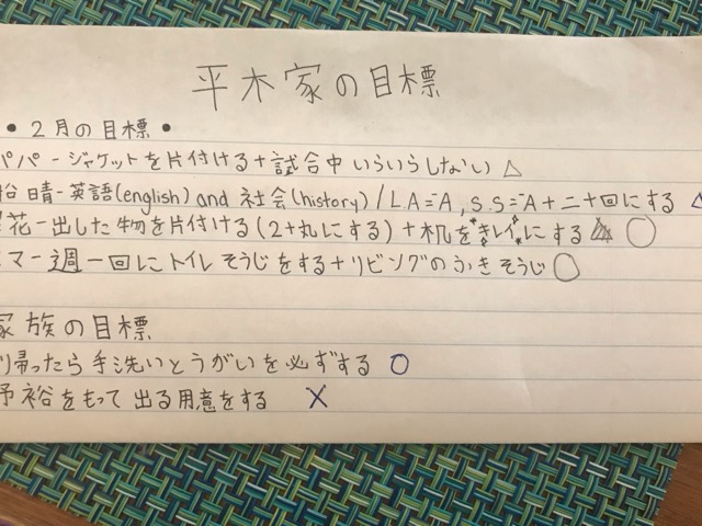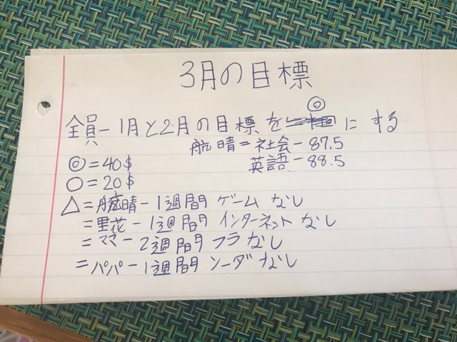 [PR] ×[PR]上記の広告は3ヶ月以上新規記事投稿のないブログに表示されています。新しい記事を書く事で広告が消えます。 3月家族会議 年明けで意気込んでた1月とは打って変わって、ダラダラな2月。 家族全員、目標を立ててたことも忘れてるんじゃね? というほどの達成度。なので、3月は「1月&2月 の目標を再確認。きっちり◎になるようにしよう!」となりました。同時にどうしたらきちんと目標を守れるようになるだろうという話し合いもしました。守れたらご褒美?守れなかったら罰?どっちが良いんだろう・・・???で、こうなった 私のフラは週1なので、2回分で計算されました(とほほ)今月の書記は航晴でした! [1回]PR